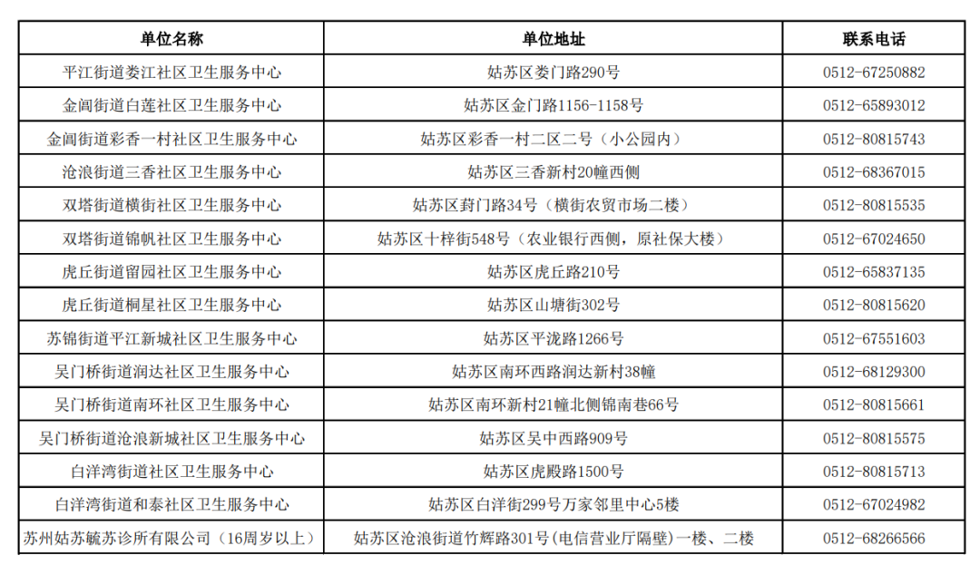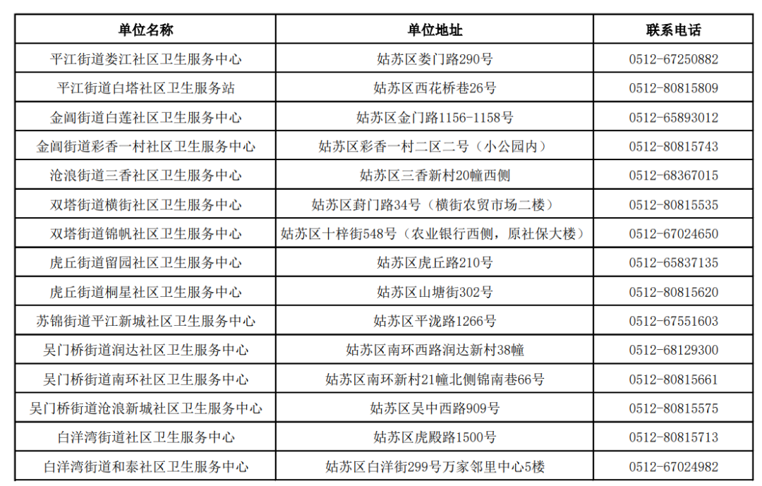 居民可前往就近的社区卫生服务中心或指定接种点咨询并预约接种流感疫苗,姑苏区流感疫苗接种单位信息如下: